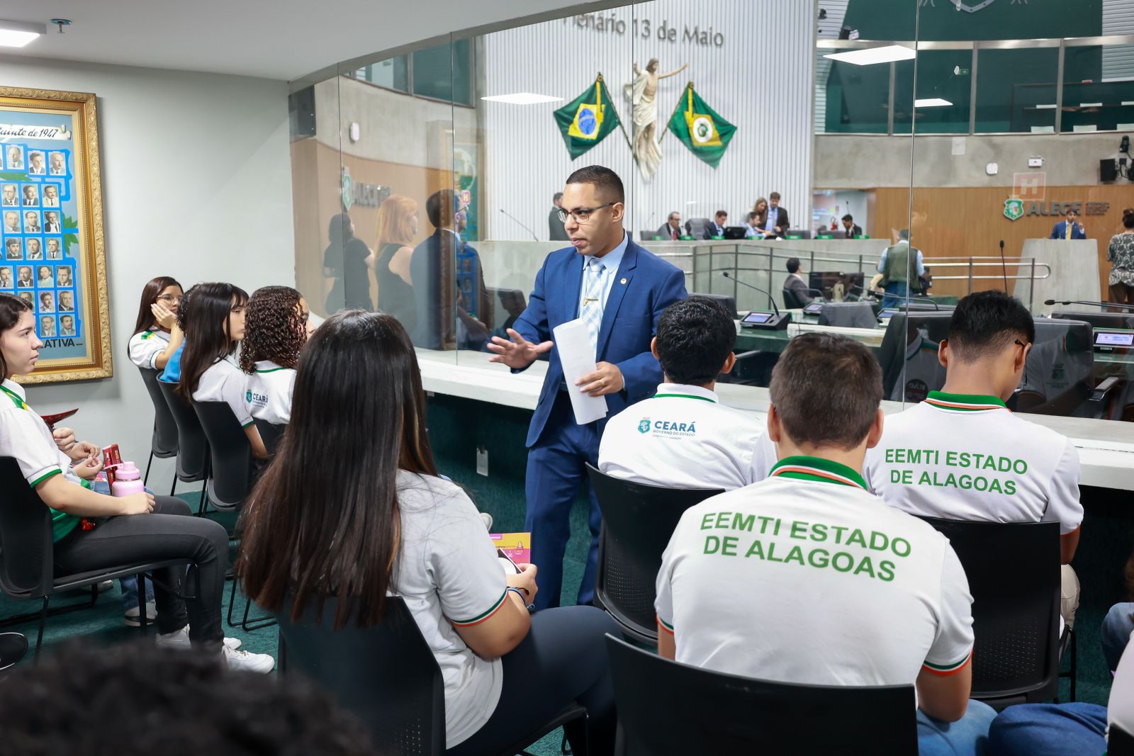 Antes de conhecer o Plenário 13 de Maio, os alunos foram recebidos pelo deputado Guilherme Sampaio (PT) no Comitê de Imprensa da Casa. Ele explicou o funcionamento da Alece, as funções das comissões técnicas, o processo de tramitação, discussão e votação de projetos e outras iniciativas no Parlamento.